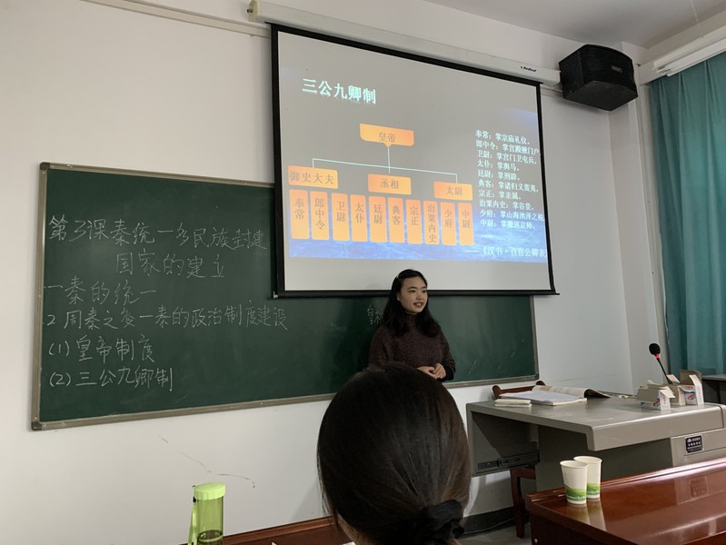 本次教学技能展示在田家炳教育书院211教室举行,邀请师大学附中的高级教师许彩霞、万象城awc888教授李晓英和云亭青年教授张连银为评课教师,同学们展开集中观摩。本次展示主要以“同课异构”的形式为主,李凡和马海春两位同学基于不同的教材版本,围绕着“秦的统一和多民族国家的建立”的部分内容进行讲授。两位同学讲课结束后,三位老师分别给予点评。